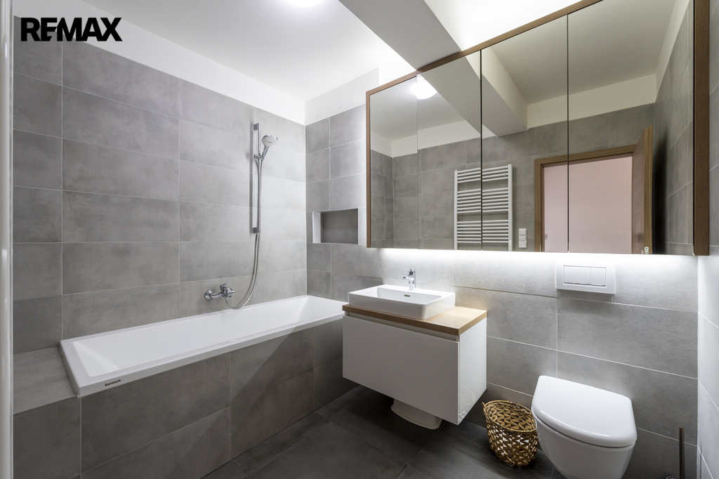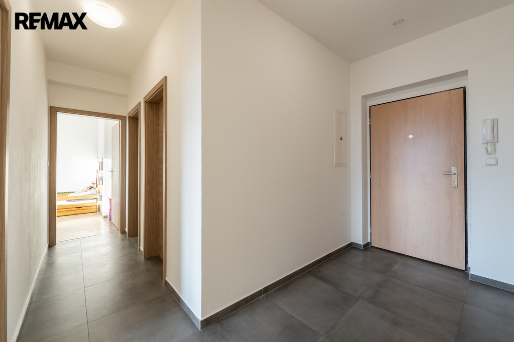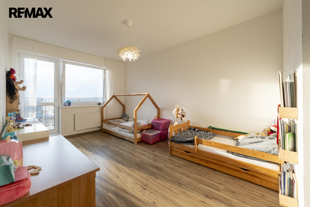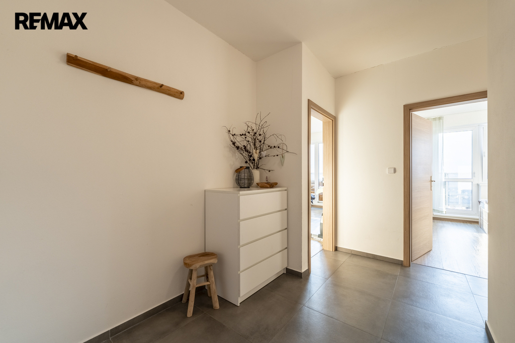 Dispozice bytu je velmi prakticky řešená. Ze vstupní chodby se dostanete do všech místností – prostorného dětského pokoje, ložnice, kde zůstává k dispozici šatní skříň i komoda, dále do moderní koupelny s vanou, která zaujme svým čistým a elegantním designem.