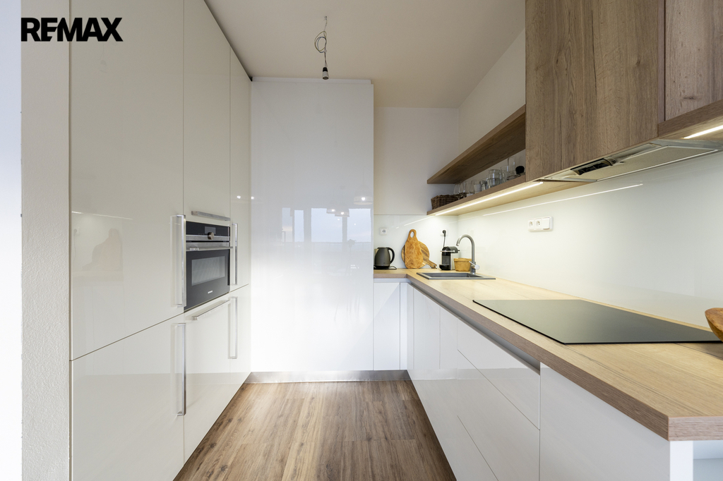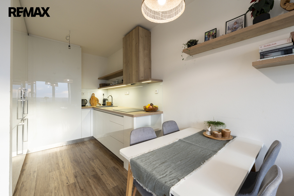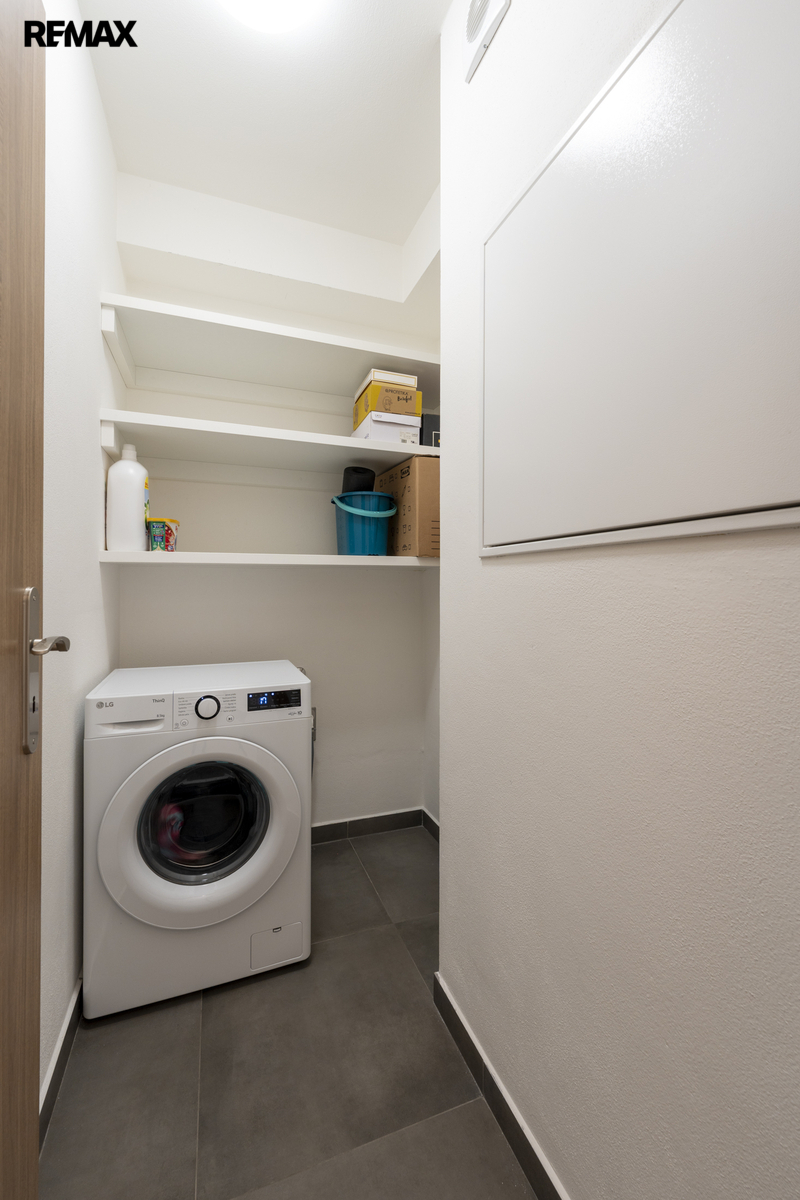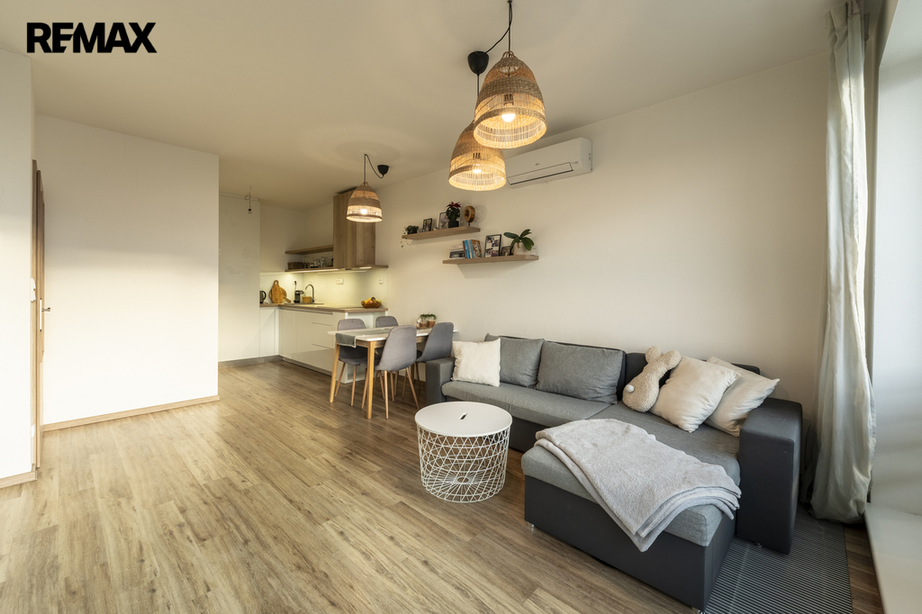 Srdcem celého bytu je velkorysý obývací pokoj propojený s kuchyní. Kuchyňská linka je opravdu prostorná a plně vybavená všemi spotřebiči, takže poskytuje maximální komfort pro každodenní vaření. V obývací části zůstává k dispozici sedací souprava a jídelní stůl, což zajišťuje pohodlné a praktické bydlení bez nutnosti dalších investic.