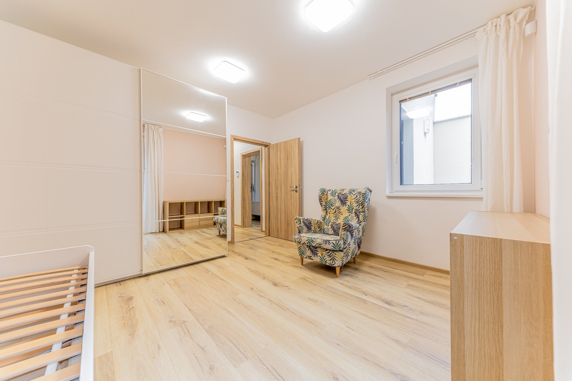 Ve 2. NP (63 m²) se nachází prostorná ložnice s francouzským oknem se zábradlím a dva samostatné dětské pokoje opět s francouzským oknem se zábradlím, oba navíc s přímým vstupem na terasu (9 m²), opět orientovanou na východ s krásným výhledem do zahrady a na centrum města Zlína. Podlaží doplňuje vkusná koupelna se sprchovým koutem, vanou a WC.