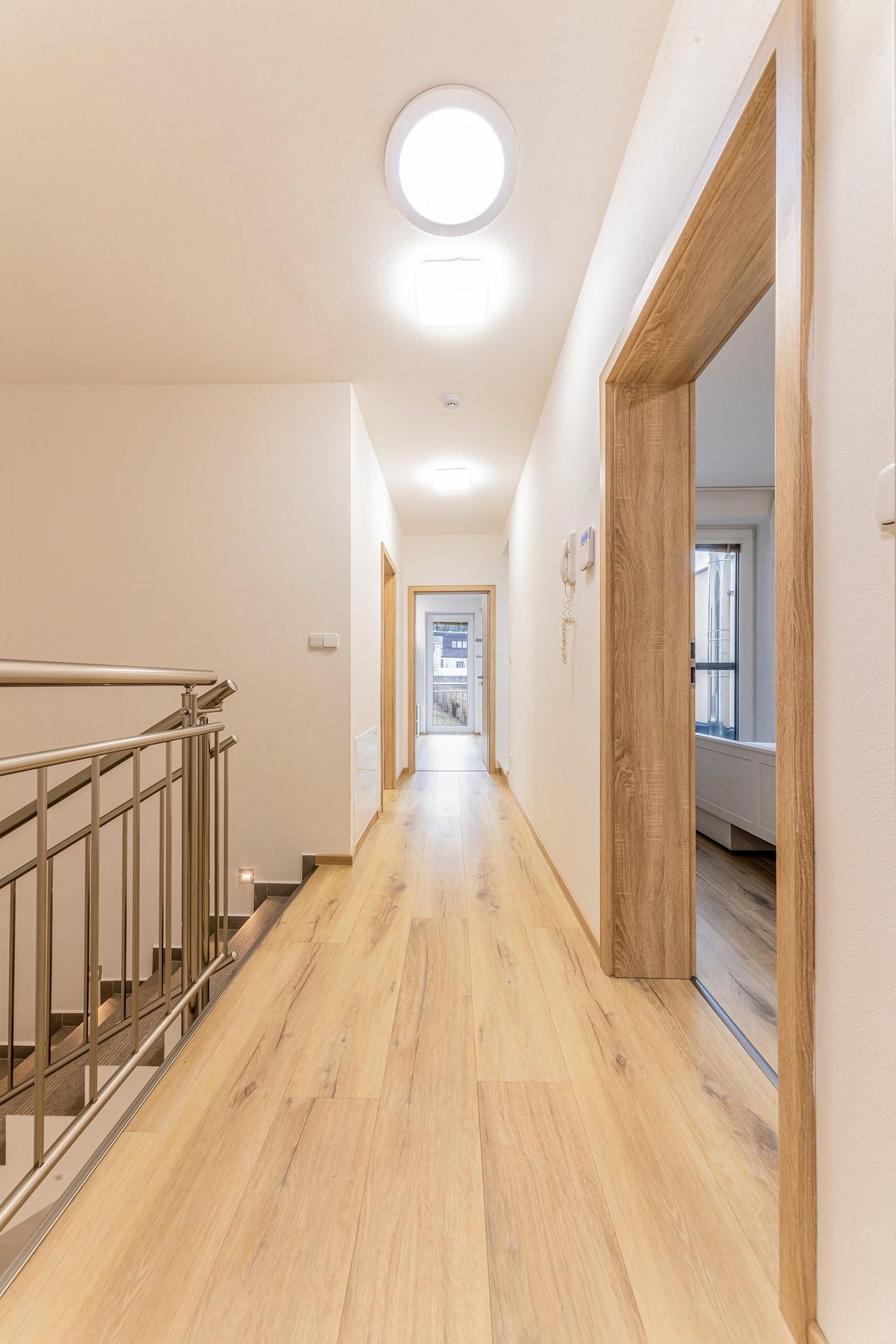 Nepostradatelným prvkem interiéru je elegantní schodiště procházející celým domem s leštěným zábradlím a decentním osvětlením, které umocňuje pocit vzdušnosti a moderního designu. Promyšlená dispozice domu zajišťuje dostatek přirozeného světla v celém interiéru, zatímco světlík ve 2. NP krásně prosvětluje chodbu i schodišťový prostor a podtrhuje vzdušnost domu.