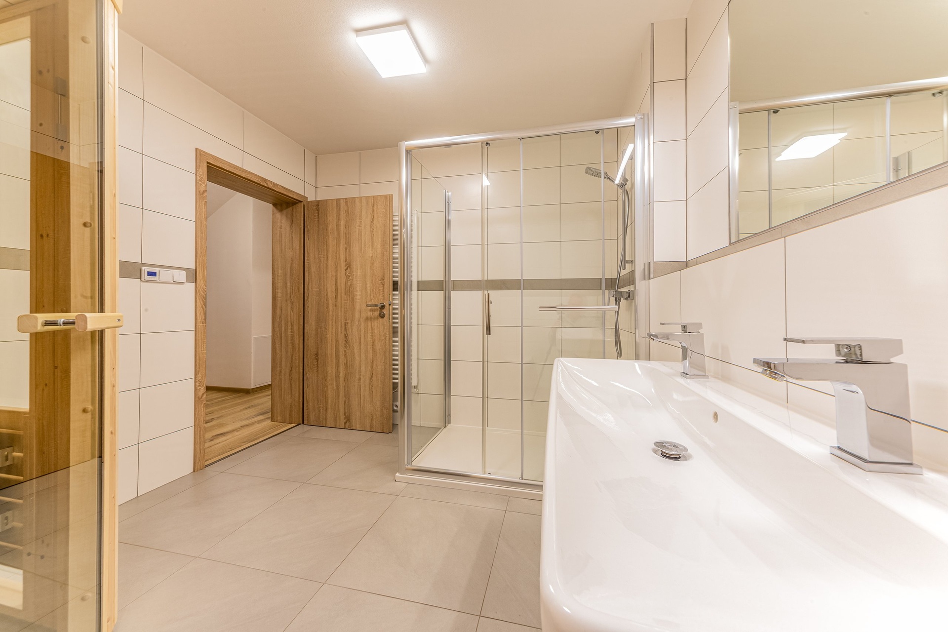 V suterénu domu (60 m²) je k dispozici prostorný obývací pokoj s kuchyňskou linkou a ložnicí, obě místnosti s přímým vstupem do zahrady skrze velkorysou terasu (27 m²) s východní orientací, kde si v letních dnech vychutnáte ranní slunce a příjemné posezení s rodinou či přáteli. Pro milovníky wellness je zde v rámci prostorné koupelnové části moderní sauna se sprchovým koutem a WC, která umožňuje regeneraci a odpočinek přímo v pohodlí domova. Součástí suterénu je také samostatná komora, chytře řešený úložný prostor pod schodištěm a technická místnost s dalším úložným prostorem.