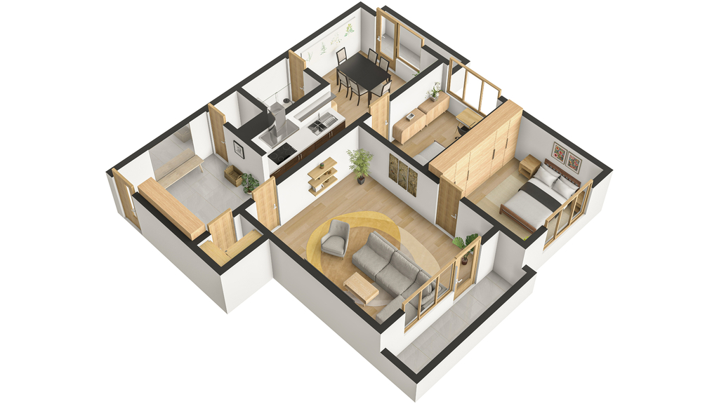 Dispoziční řešení bytu je praktické a funkční. Dominantou je prostorná vstupní hala s vestavěnou skříní a šatnou, která bytu dodává příjemný pocit prostoru i dostatek úložného zázemí. Z haly se vstupuje do obývacího pokoje s výstupem na lodžii, na který navazuje samostatná ložnice či pokoj. Samostatná kuchyně má rovněž vstup na druhou lodžii a navazuje na ni další samostatný pokoj. K dispozici je dále samostatné WC a zděná koupelna s vanou. V obytných místnostech jsou parkety, v hale a kuchyni PVC.