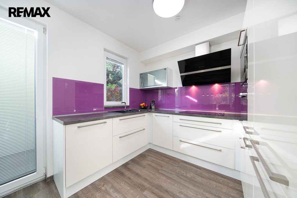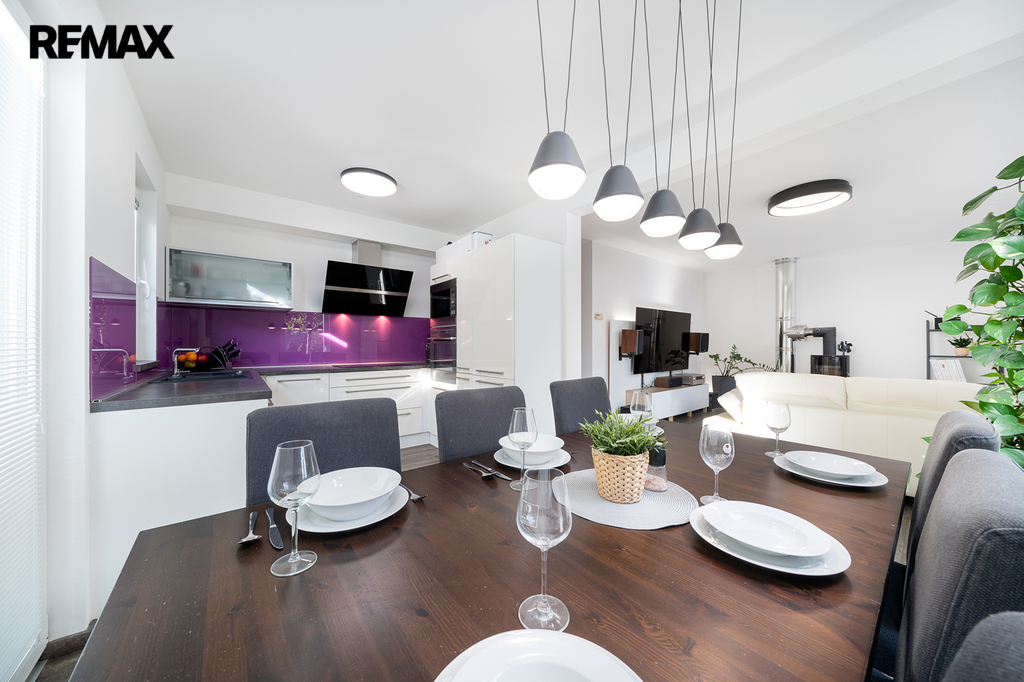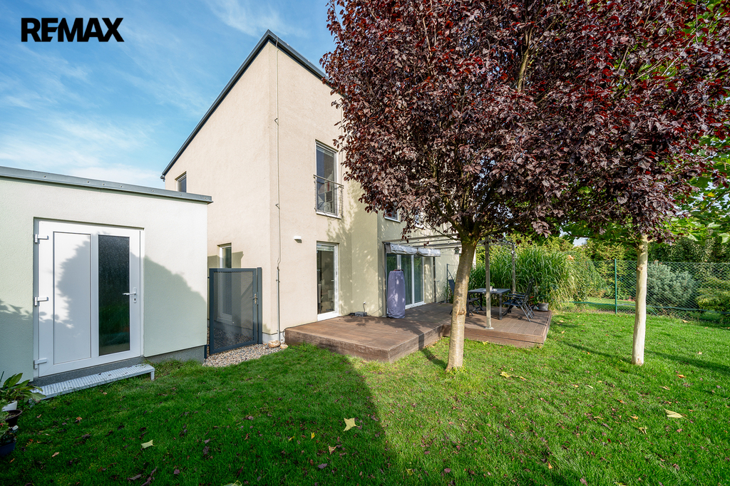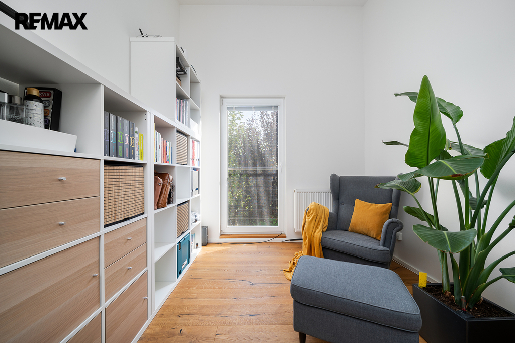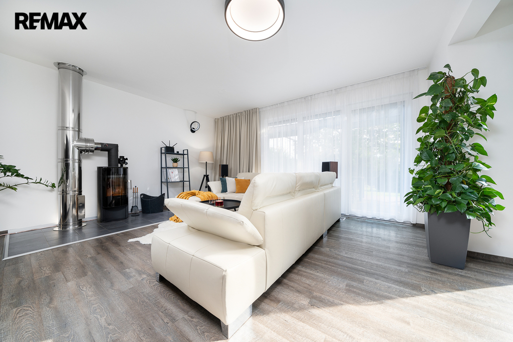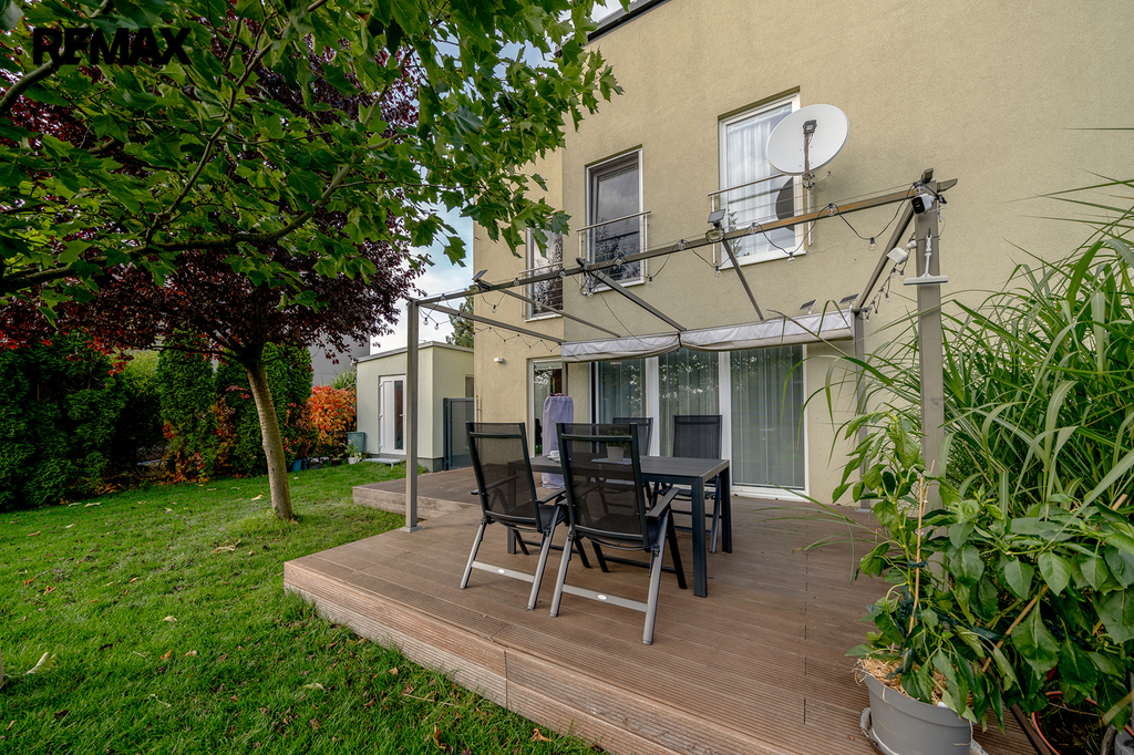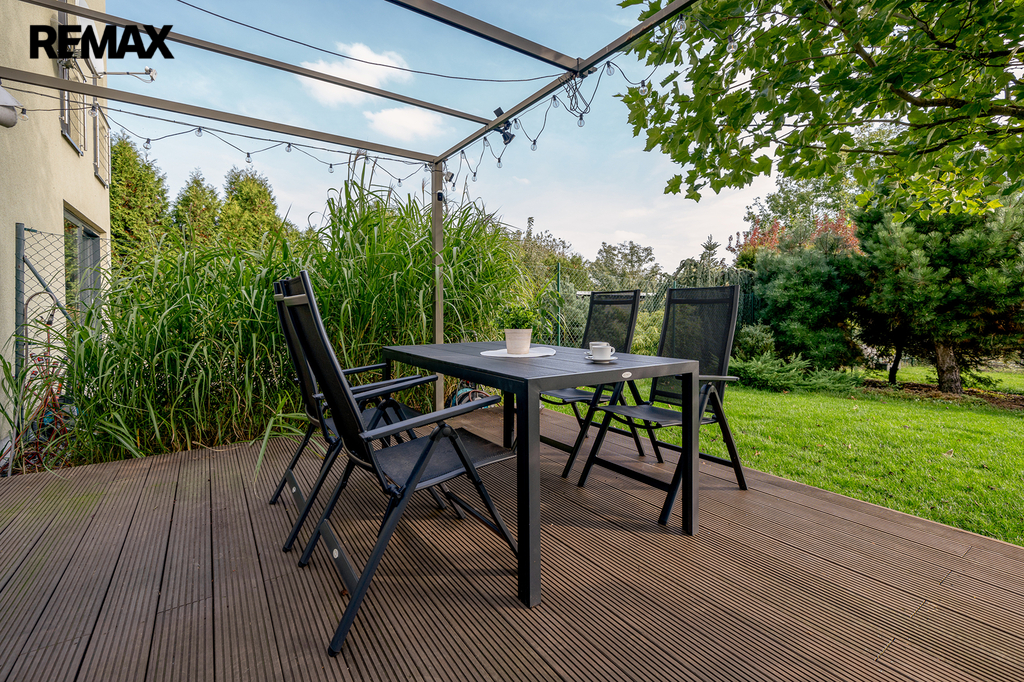 V přízemí se nachází světlý a prostorný obývací pokoj s jižní orientací, který navazuje na plně vybavený kuchyňský kout. Z obývacího pokoje je přímý vstup na terasovou část (cca 30 m²) a zahradu, ideální pro relaxaci i rodinné posezení.