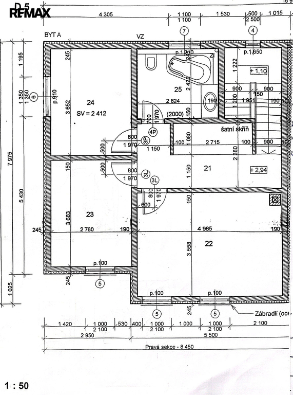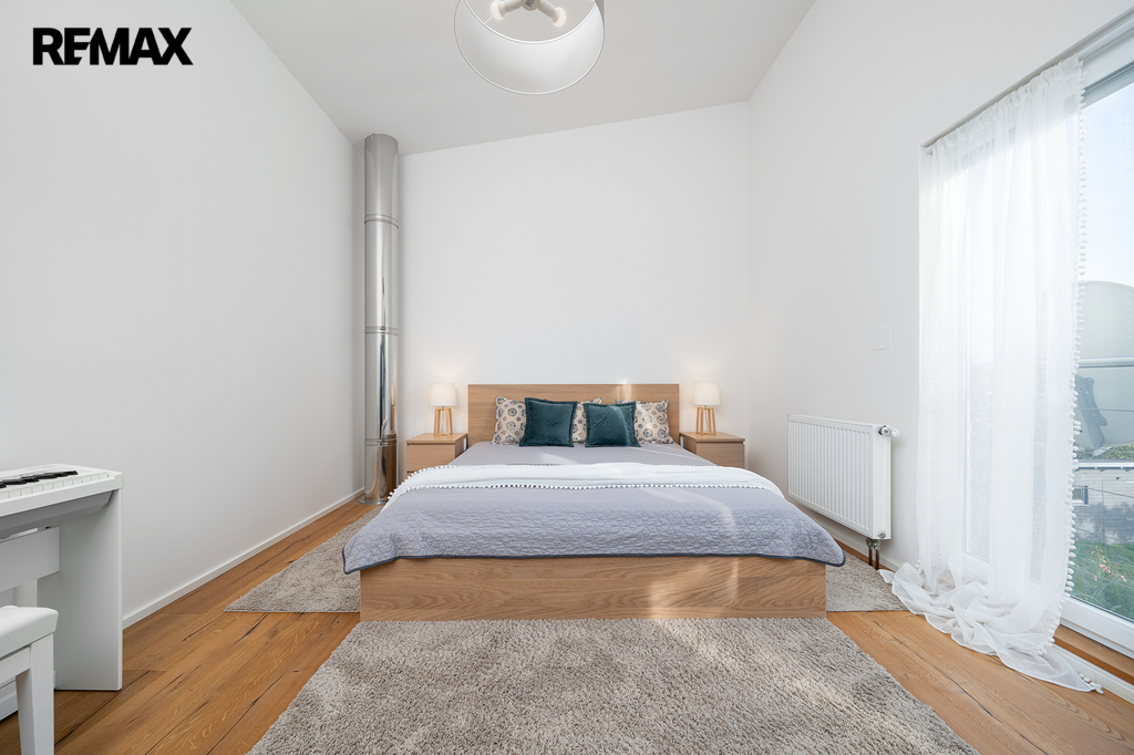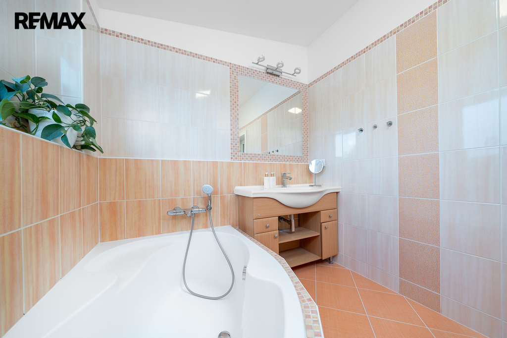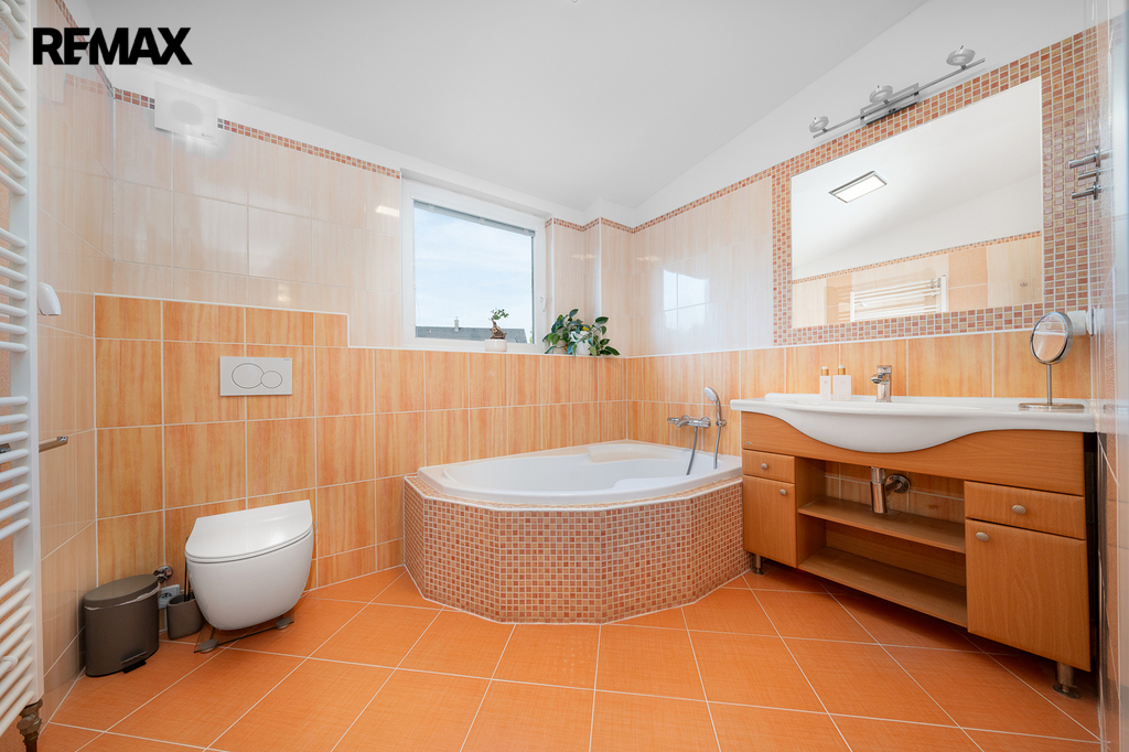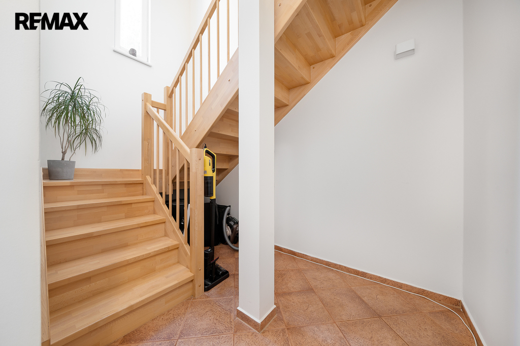 V patře se nachází tři samostatné pokoje a koupelna s vanou. Součástí horního podlaží je i vestavěná skříň s dostatkem úložného prostoru.