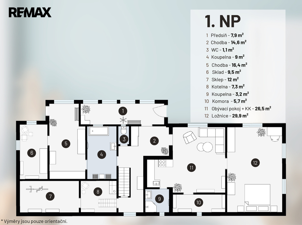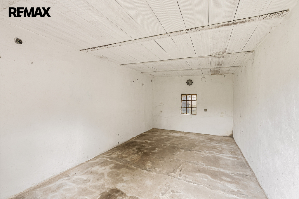 • Předsíň, chodba, WC, koupelna, chodba, kuchyň spojená s obývacím pokojem, ložnice, komora + skladovací a sklepní prostory.
