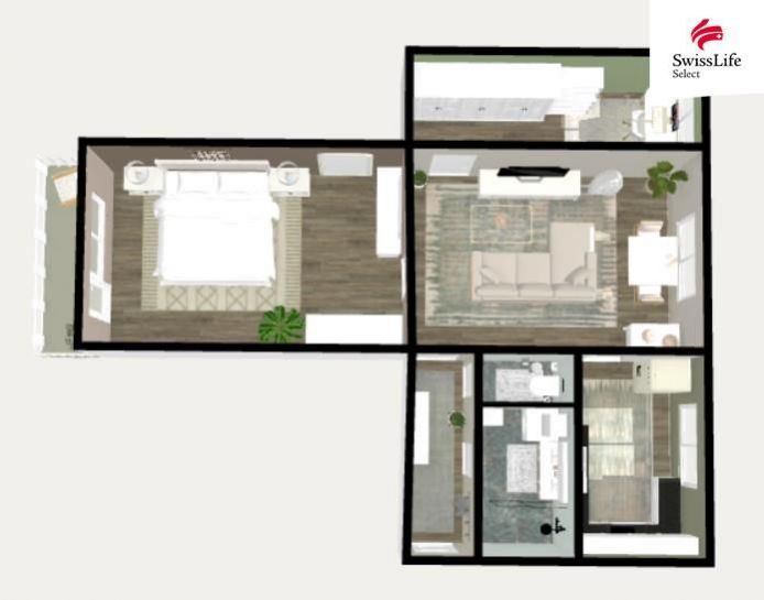 Dispozice bytu nabízí dostatek prostoru pro vytvoření harmonického domova od otevřeného obývacího prostoru až po klidové zóny pro odpočinek.