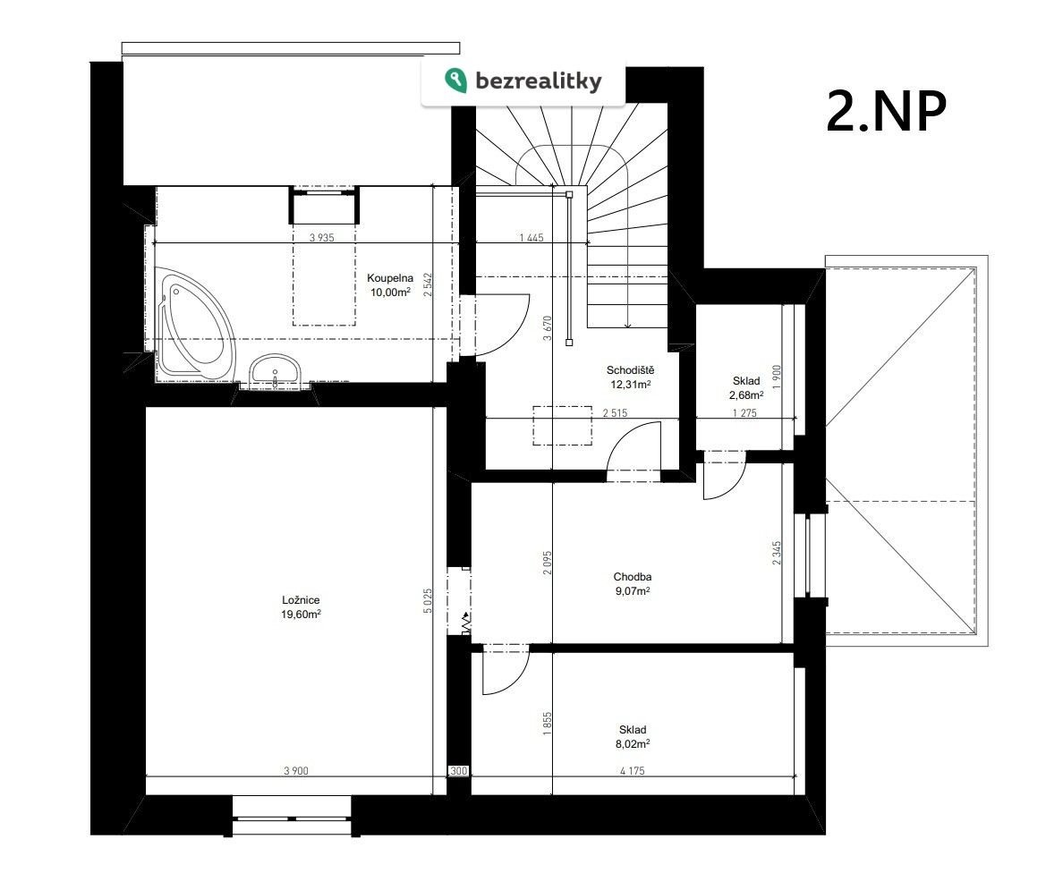 V horním podlaží je situována klidová část domu s prostornou ložnicí, koupelnou, dvěma úložnými místnostmi a centrální chodbou.