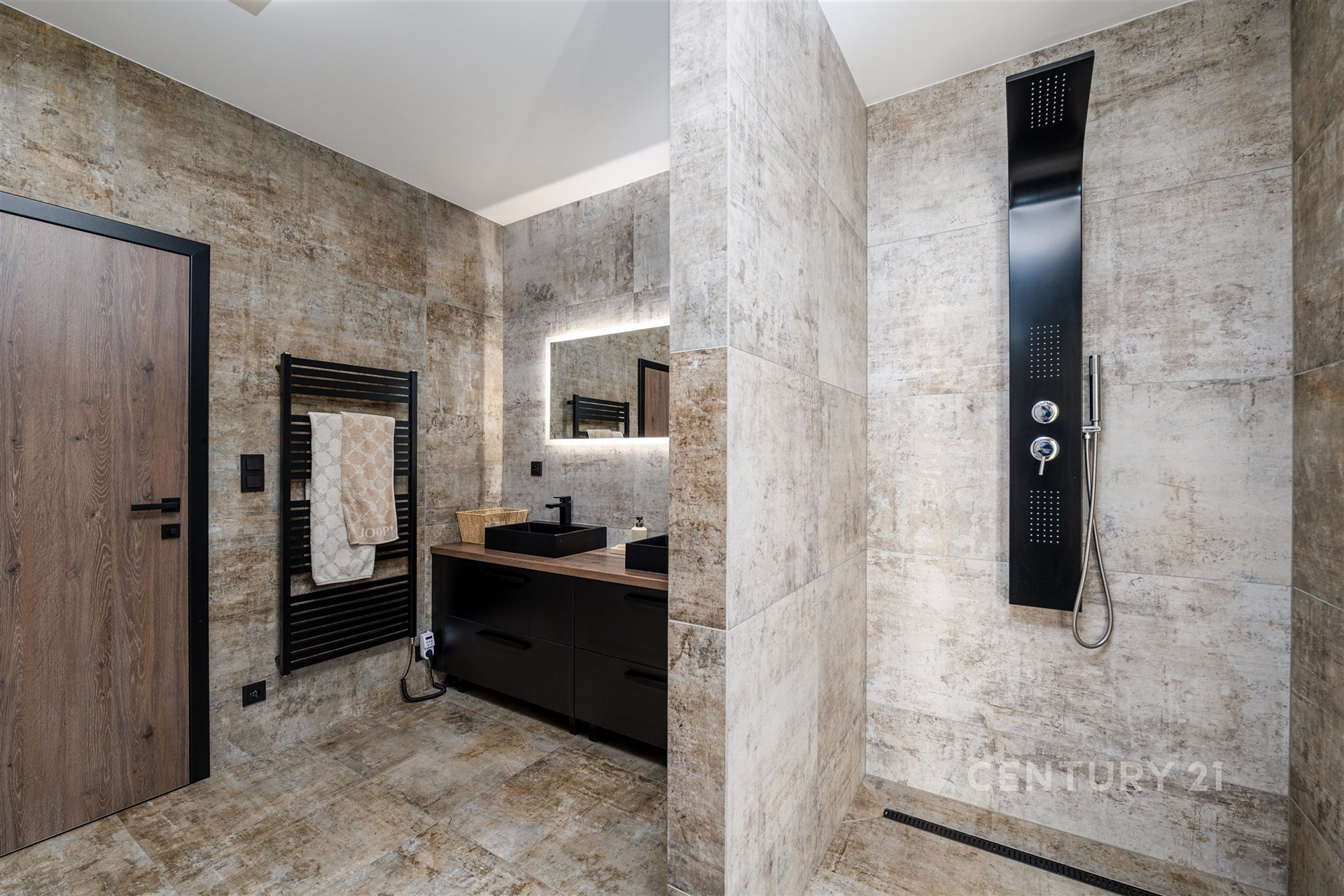 Hlavní koupelna je malý domácí wellness: ráno rychlá sprcha pro energii, večer teplá vana jako bezpečný úkryt před světem.
