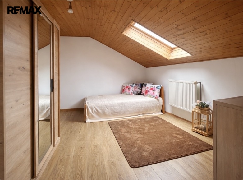 V podkroví jsou tři ložnice. Jedna aktuálně slouží jako šatna. Ústí na prostornou terasu s výhledem na okolí. Menší, velmi dobře udržovaný objekt s menší zahradou, s okrasným záhonem, a sezóním posezením pod přístřeškem.