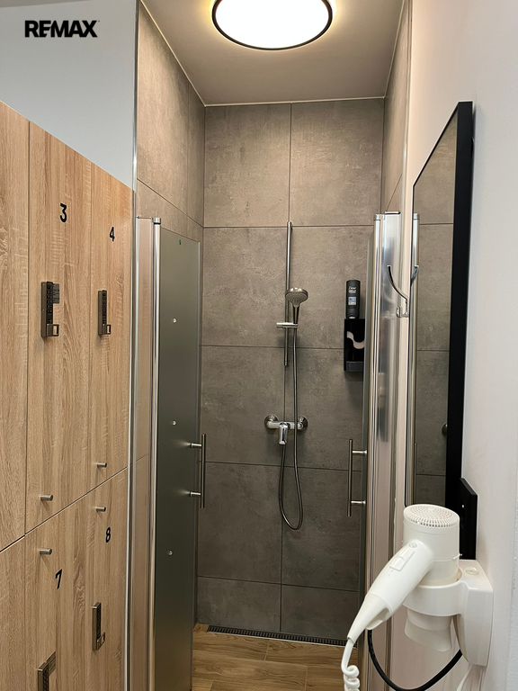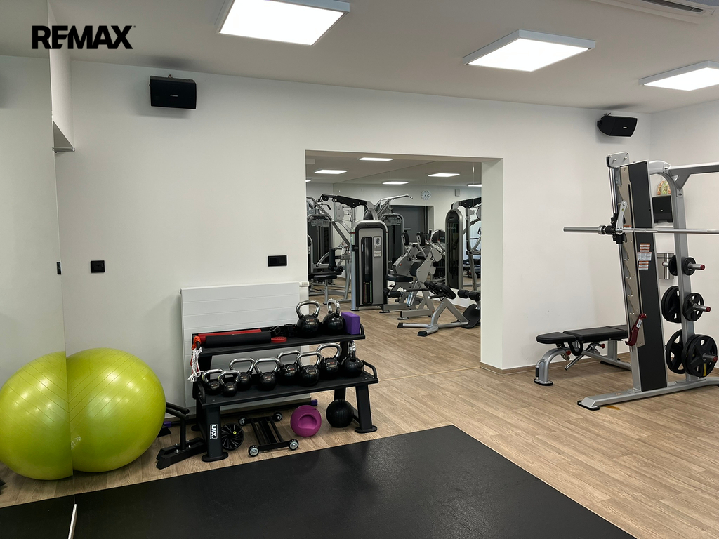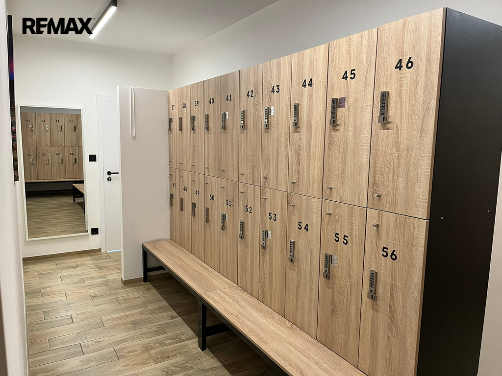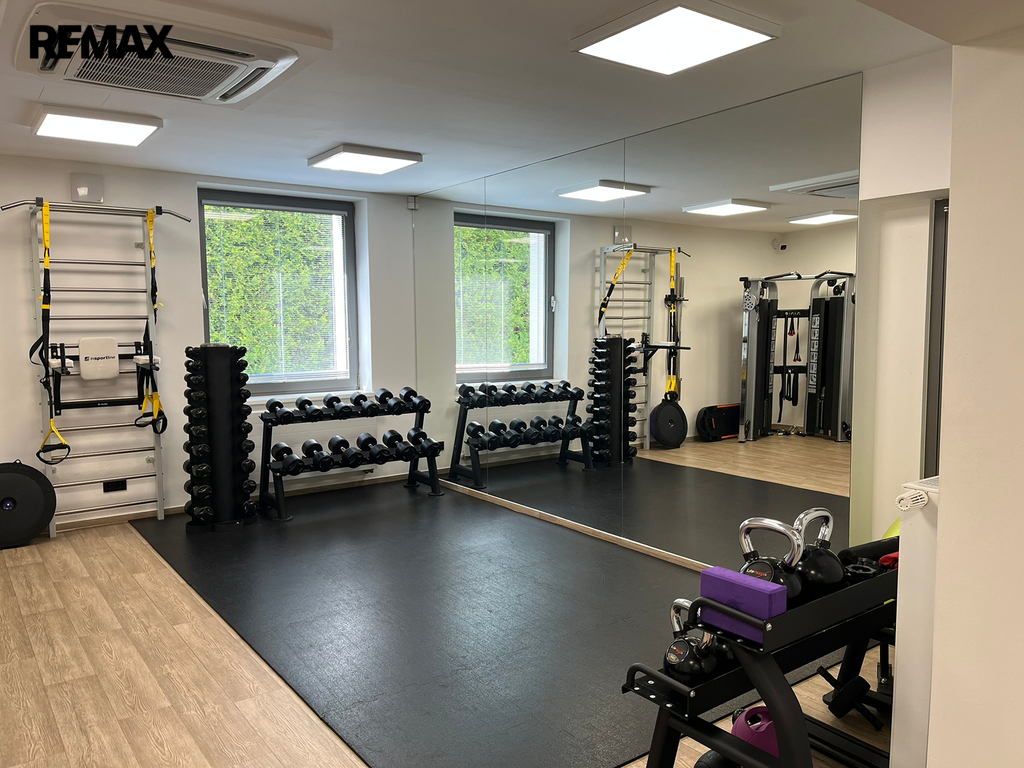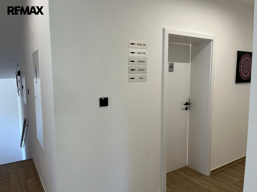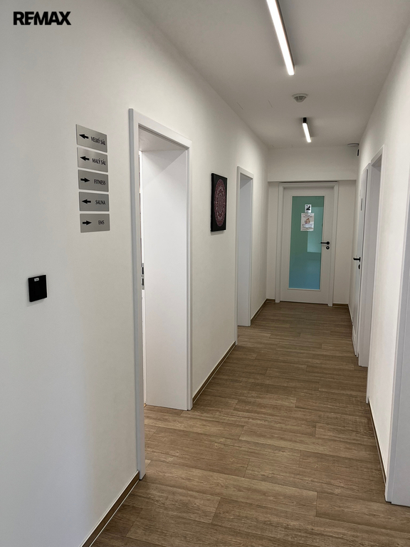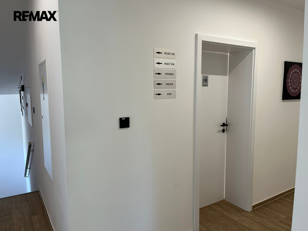 Prostor A – 206 m² (přízemí): recepce, 2 kanceláře, šatny pro muže a ženy se sprchou a WC, fitness sál, sklad, bezbariérový vstup, WC pro invalidy.