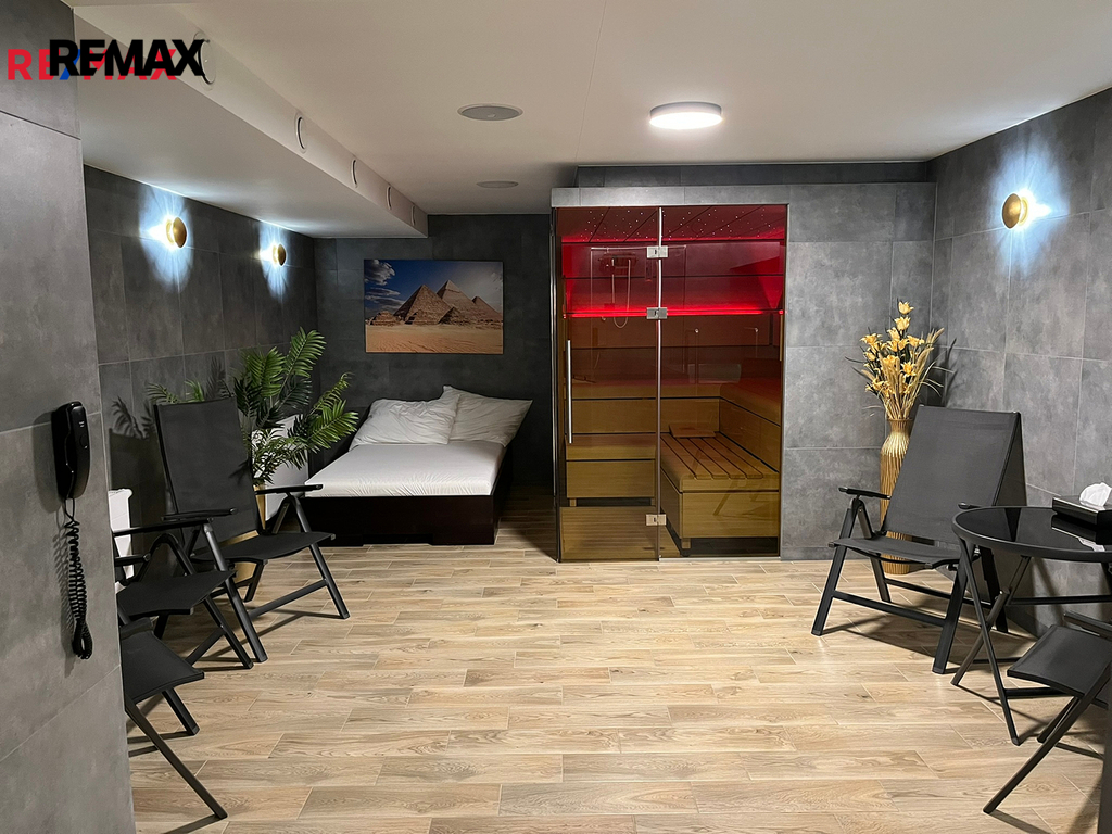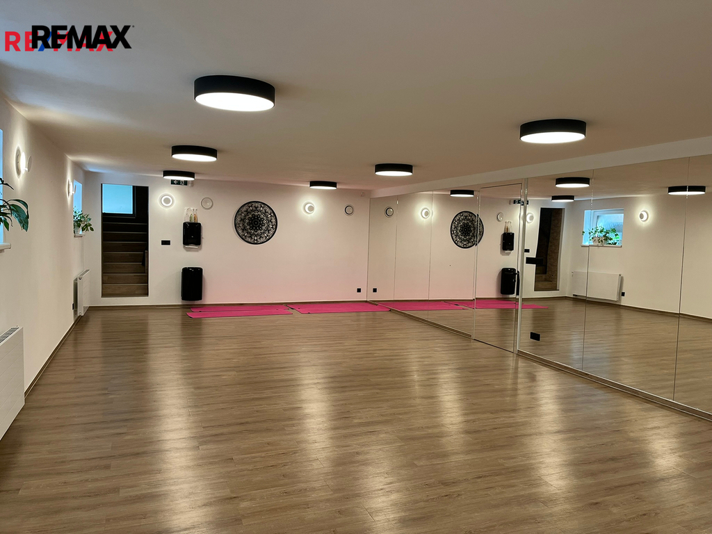 Prostor B – 192 m² (v suterénu / 1. podzemním podlaží): prostorná jógová místnost, kuchyňka, 3 sklady, privátní finská sauna / bio s odpočívárnou, sprchou a WC, chodba s WC, možnost přímého vstupu ze zahrady.