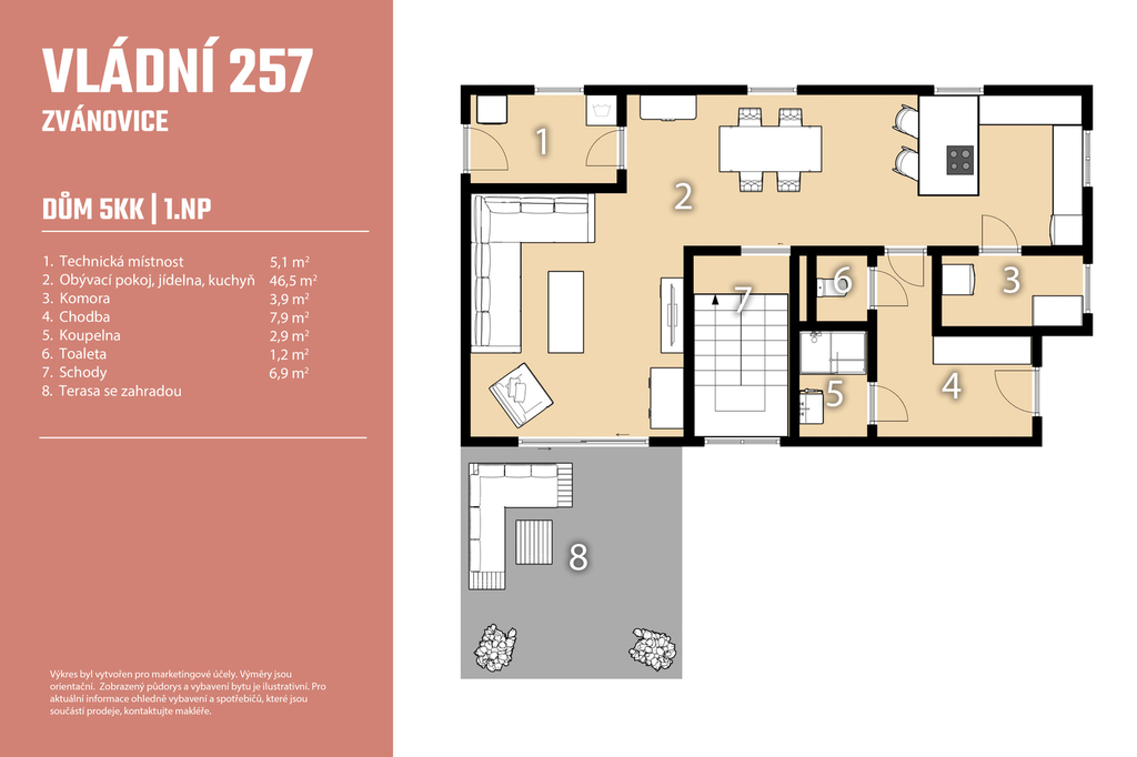 Dům je nízkoenergetický, vytápěný tepelným čerpadlem, s podlahovým topením, rekuperací a elektrickými roletami. Dispozice nabídne prostorný obývací pokoj s výstupem na terasu s krásným výhledem, kuchyňský kout, ložnici, tři další pokoje, koupelnu i technické zázemí. Ať už hledáte další pokoj, klidnou pracovnu nebo vlastní domácí fitness, tady si prostor přizpůsobíte podle sebe. 945 m² zahrady znamená prostor pro děti, bazén, grilování i klidné zahradničení. Mírný svah nabízí možnost vytvořit terasy nebo zajímavé zahradní prvky. Oplocení zatím není realizováno, což dává příležitost zvolit si styl i míru soukromí podle sebe. K domu máme připravenou i virtuální prohlídku, díky které si nemovitost projdete z pohodlí domova – rád Vám ji zašlu.