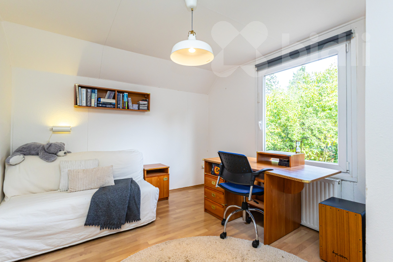 V patře domu kuchyně s velkým jídelním prostorem a vstupem na terasu a zahradu, obývací pokoj, pokoj pro hosty,.